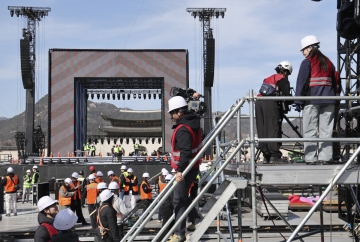 ▲그룹 방탄소년단(BTS)의 컴백 공연을 앞둔 20일 서울 광화문광장에서 공연 준비작업이 이뤄지고 있다. 뉴시스